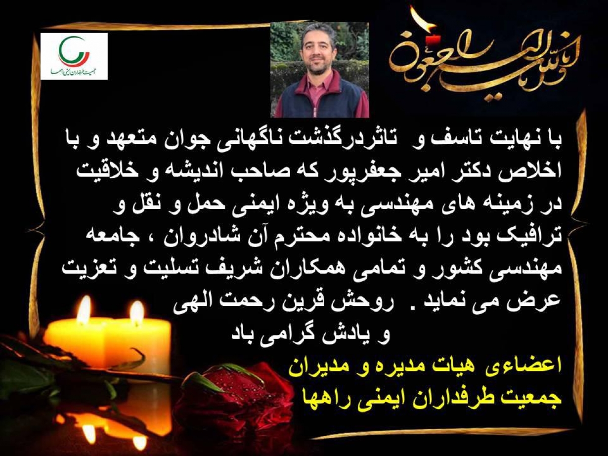 با نهايت تاسف و تاثر درگذشت ناگهاني جوان متعهد و با اخلاص، دكتر امير جعفرپور كه صاحب انديشه و خلاقيت در زمينههاي مهندسي به ويژه ايمني حمل و نقل و ترافيك بود را خانواده محترم آن شادروان، جامعه مهندسي كشور و تمامي همكاران شريف تسليت و تعزيت عرض مينمايد. روحش قرين رحمت الهي و يادش گرامي باد.